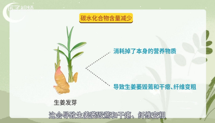 生姜发芽主要是碳水化合物含量减少,消耗掉了本身的营养物质,来供给芽生长,这会导致生姜萎毁蔫和干瘪、纤维变粗。所以说发了芽的生姜营养成分是会减少的,营养价值也会降低。
