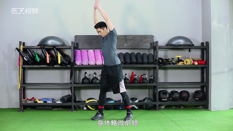 双腿分开一点点,双手并拢,上下相叠,然后抬起,身体略微前倾,抬膝同时手往下放,手往上抬的时候整个身体和手成一条直线。
