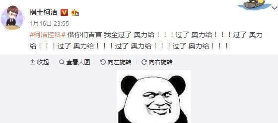 清华也放暑假了,从清华期末考试的成绩来看,柯洁还没有上课,并且本人兴奋地在微博上披露了自己的战绩,连续给出了6个“奥利给”,特别是那幅画是大家都喜欢的网络熊猫的搞笑图,很多人看起来很开心。