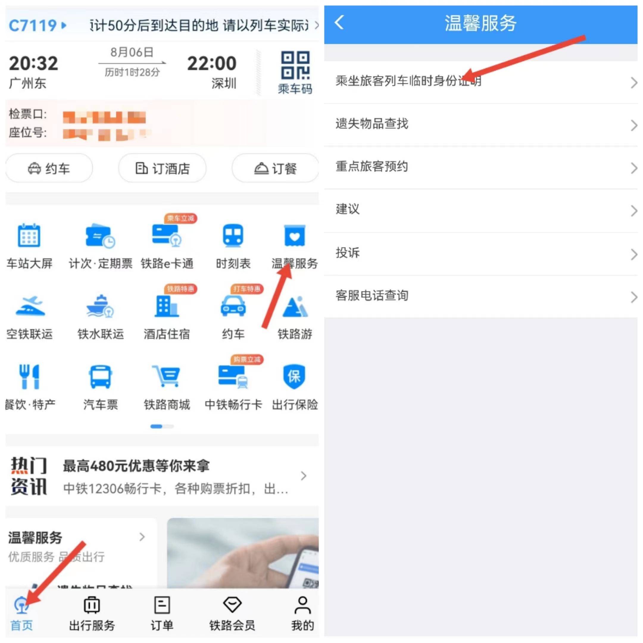 一是:前往高铁站或火车站的综合服务中心,人工柜台窗口找工作人员办理纸质临时身份证明