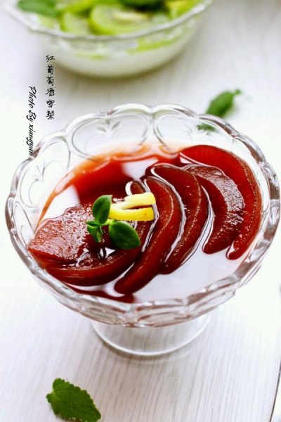 6、红葡萄酒,没过梨为准,我用的是自家酿的红葡萄酒,甜味够足,所以无需再额外加糖,如果你用的葡萄酒甜度不够,请酌情加冰糖,大火煮开,小火大约三十分钟,梨煮软为准,关火晾凉
