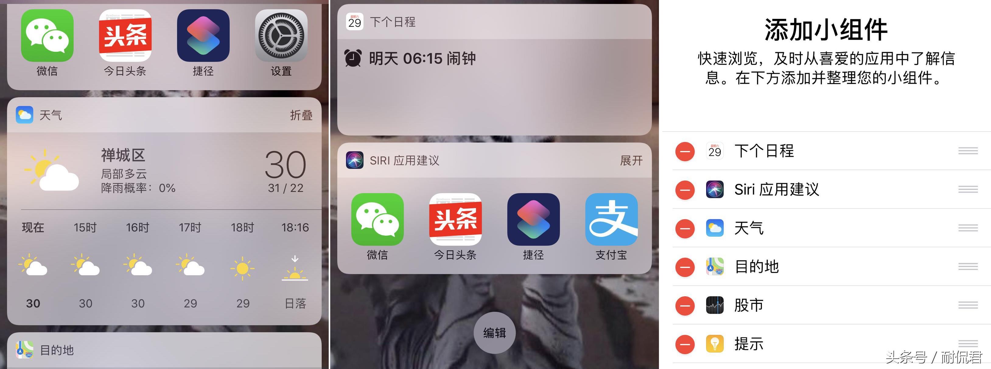 滑动到小组件那一屏,滑到下部看到编辑按钮,看到右侧小组件列表,点击左侧红色减号就可以删除不需要的组件