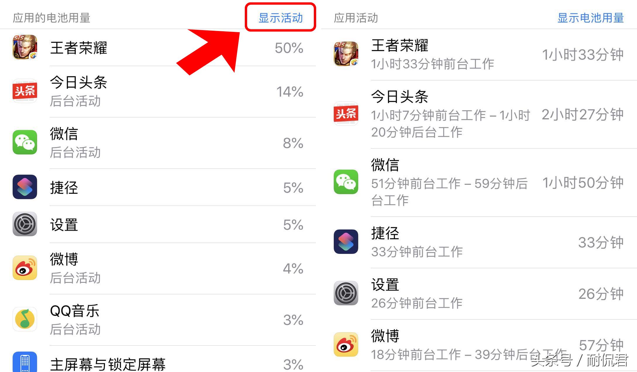 (左图可以看到耗电排行,右图可在右侧看到App在前后台运行的时间)