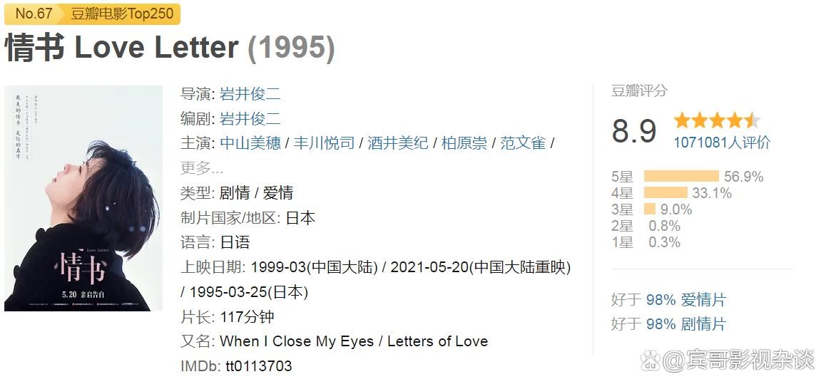 这部电影使岩井俊二一跃成名,《情书》也成为一部难以逾越的经典作品,整部电影,每一个画面都能够深深打动人心。日本是个爱下雪的国家,在这个白色的国度里讲述了一个纯情的故事,20年来每每想起总让人泪流满面。