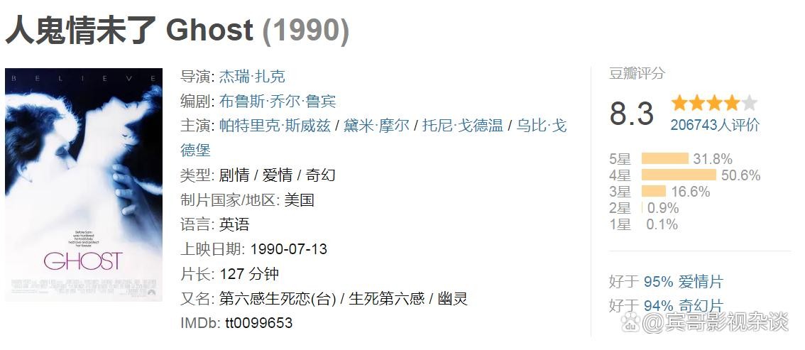 本片由杰瑞·扎克执导,于1990年正式上映。编剧的脑洞奇大,人鬼恋的题材在90年代还是非常新颖的。。导演对节奏的掌握拿捏有余。,最重要的是男女主的颜值也都在线,至死不渝的爱恋更让人感动,那个黑人灵媒也非常逗逼,更沉重氛围增添些许乐趣。做陶器的名场面和久听不厌的主题曲,让多少观众沉浸在这场跨越生死的爱恋之中。