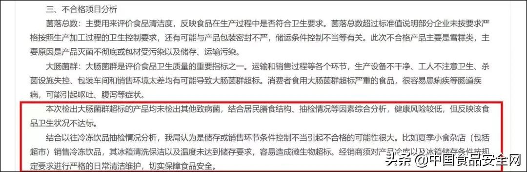 《中国食品安全网》记者查阅资料发现,温州市市场监管局对此次抽检不合格项目的分析中也表示,检出大肠菌群超标的产品均未检出其他致病菌,结合以往冷冻饮品抽检情况分析,认为是储存或销售环节条件控制不当引起不合格的可能性很大,比如夏季小食杂店(包括超市)销售冷冻饮品,其冰箱清洗保洁以及温度未达到储存要求,容易造成微生物超标。