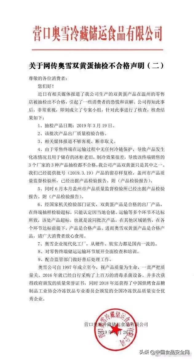 奥雪方面随后发表声明称,该批次产品出厂质量检验合格,造成抽检不合格的原因可能由于零售终端在运输保存过程中无任何冷链保护,导致产品发生化冻情况。