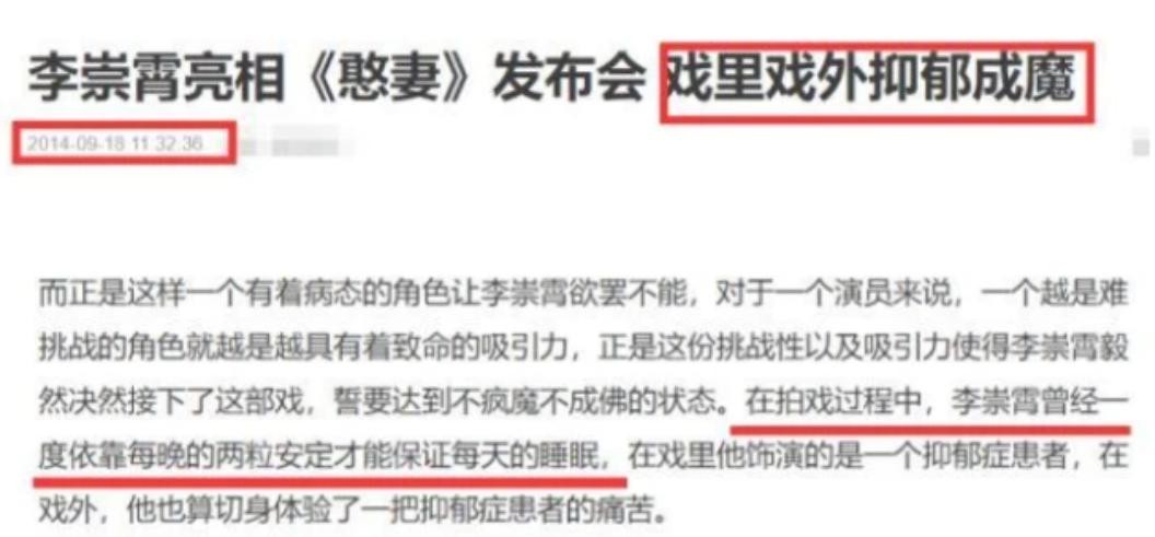 在多年前,就有报道称李崇霄因为在《憨妻》中饰演了一位抑郁症患者,所以入戏太深,在戏外也需要依靠服药才能入眠。