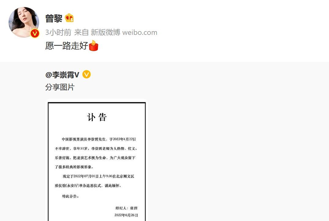 李崇霄演戏有实力,人缘也不错,有很多圈中好友,昔日的合作伙伴曾黎也发文悼念李崇霄的离开。