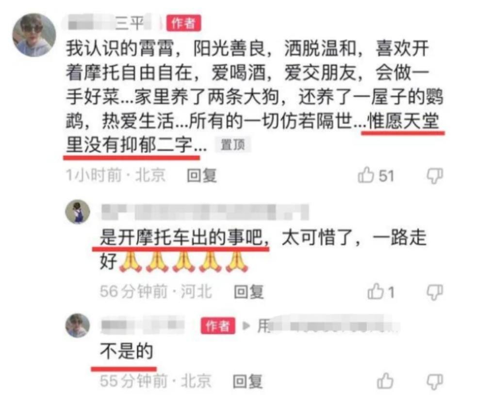 在李崇霄去世后,他的友人也发文悼念,其中谈到了:“惟愿天堂里没有抑郁二字”,而且即便有网友问到李崇霄是不是开摩托车出事的,楼主也回答网友:“不是的”,让人不得不怀疑李崇霄的去世和抑郁有关。