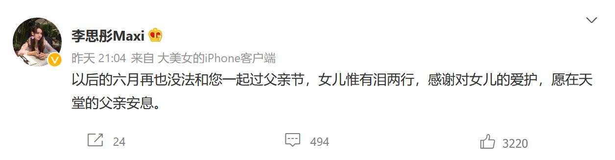 没想到,短短1个月的时间,她却和父亲天人永隔,难过的李思彤发文:“以后的六月再也没法和您一起过父亲节,女儿惟有泪两行,感谢对女儿的爱护,愿在天堂的父亲安息。”