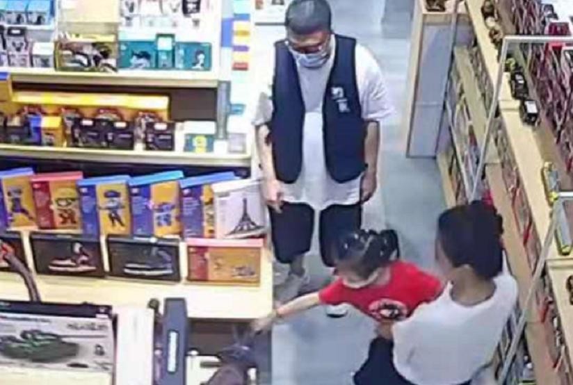还有一次,孙红雷一家三口外出逛玩具店。小朋友身穿红色T恤被妈妈抱在怀中,手指着某个玩具,似乎很想拿到手,但妈妈王骏迪并没有满足女儿的心愿。