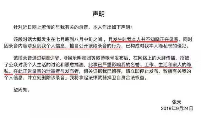 这声明里,陈奕辰把自己的责任推得一干二净,张天在9月24日晚,也发声明称这份录音给她生活和工作以及名誉都造成很大的阴影,她要告录音的泄露者和发布者,以维护自己的权益。