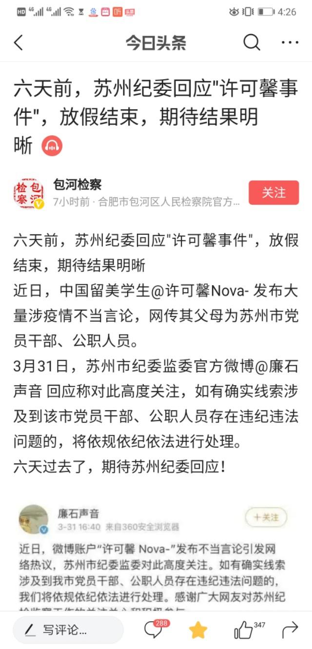 今天,看到合肥一检察院发表了对这件事的态度,期待苏州有关部门能够给一个明确的答案,不知道结果会如何,我想如果许可欣的父母有问题,要落实也需要一段时间;如果没有问题,是不可能公布其信息的,毕竟祸不及父母,孩子出的错应该有孩子承担,如果公布了他她父母的信息,肯定会受到很大的困扰。这也许是不公布其父母信息的原因吧!