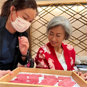叶倩文穿着红色花纹上衣,再戴上她最爱的珍珠耳环,造型简单大方。这顿饭她吃得很高兴,脸上始终挂着笑容。
