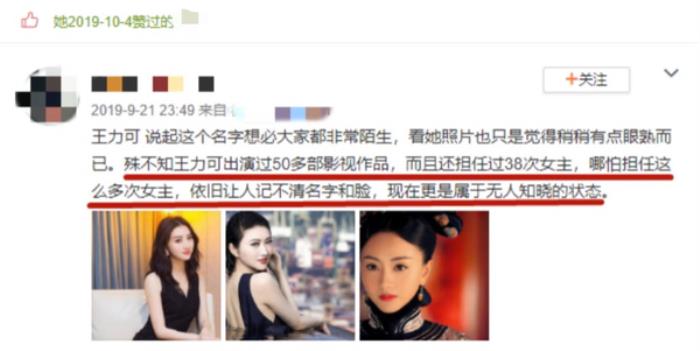 王力可称得上是霸屏演员,但其实她并不算大火,网友们提起她也总是感叹她不红,甚至她本人还点赞过这样的发言。无奈的是,对方嘲讽她无人知晓,贴出的图片却都是其他女星,王力可的点赞不知是手滑还是侧面表达不忿。