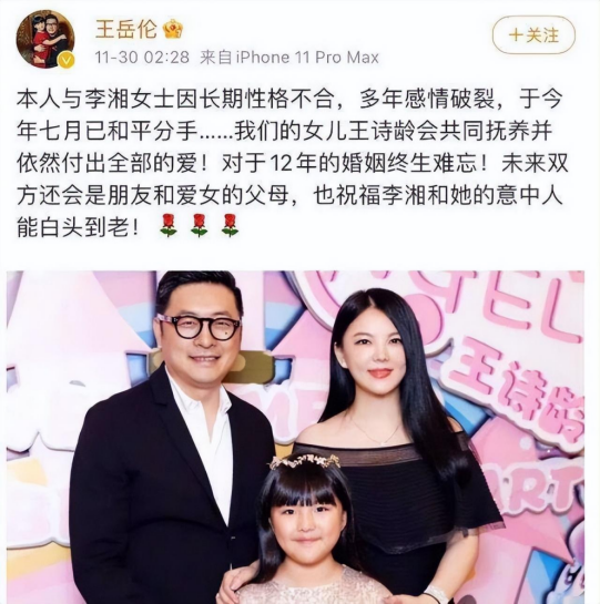 2021年11月30日凌晨,王岳伦发文称因长期性格不合,与妻子李湘于7月和平分手,还祝福李湘与她的意中人白头到老。但随后,他又将此文删除。