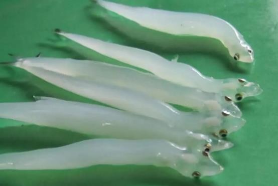 2、蒲氏粘盲鳗:栖息近海岸浅水区,常将体埋泥沙中,晚上活动,袭击鱼类,吸附它鱼的鳃上、峡部或眼上,钻入体内,食寄主内脏、肌肉。秋季产卵,卵大,长椭圆形,每端具80—90细钩。全长达半米。体液与海水等渗。分布于我国黄海和东海浅水区域;日本、朝鲜。