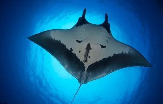 3、前口蝠鲼:暖水性中上层大型鱼类。鳃耙发达,主食浮游甲壳类,也食小型成群鱼类。体盘宽达6m余。