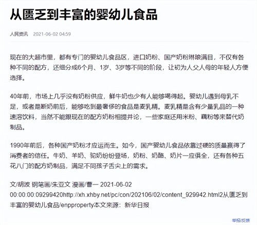 人民资讯在2021年6月2日关于《从匮乏到丰富的婴幼儿食品》的报道