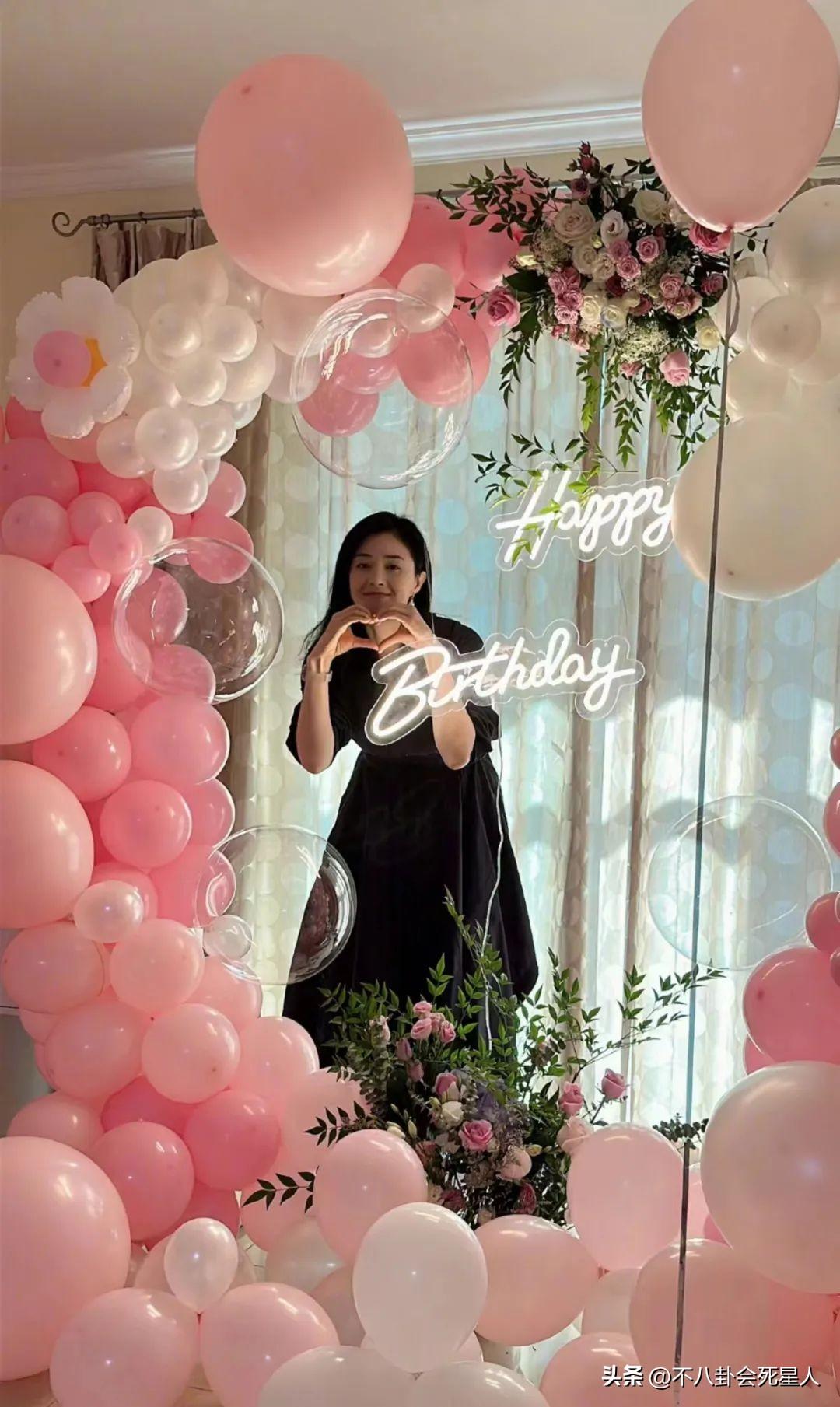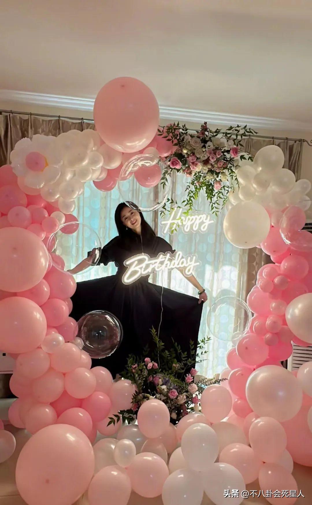 从图片来看,庆生现场布置得简单又浪漫,粉白色的气球相间,加上鲜花的点缀,蒋欣对着镜头比心,十分可爱。