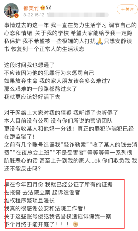都美竹宣称自己已经找到警方立案来控告那些营销号造谣,并且已经公开了所有收集到的证据,下个月即将开庭审理。
