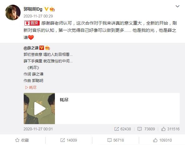 光是三大音乐平台就提前预热了半个月,而一直佛系发歌的薛之谦也意外地发布了微博,亲自为歌曲宣传,并且在微博中还提到了郭聪明的名字。