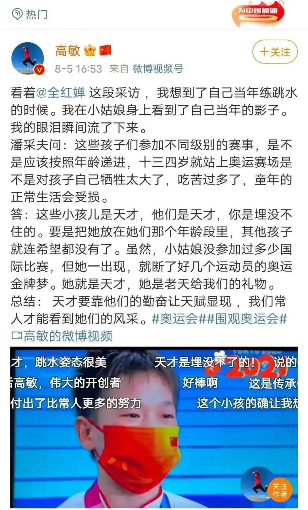 她肯定全红婵、陈芋汐两外运动员天才叙事之外的努力,