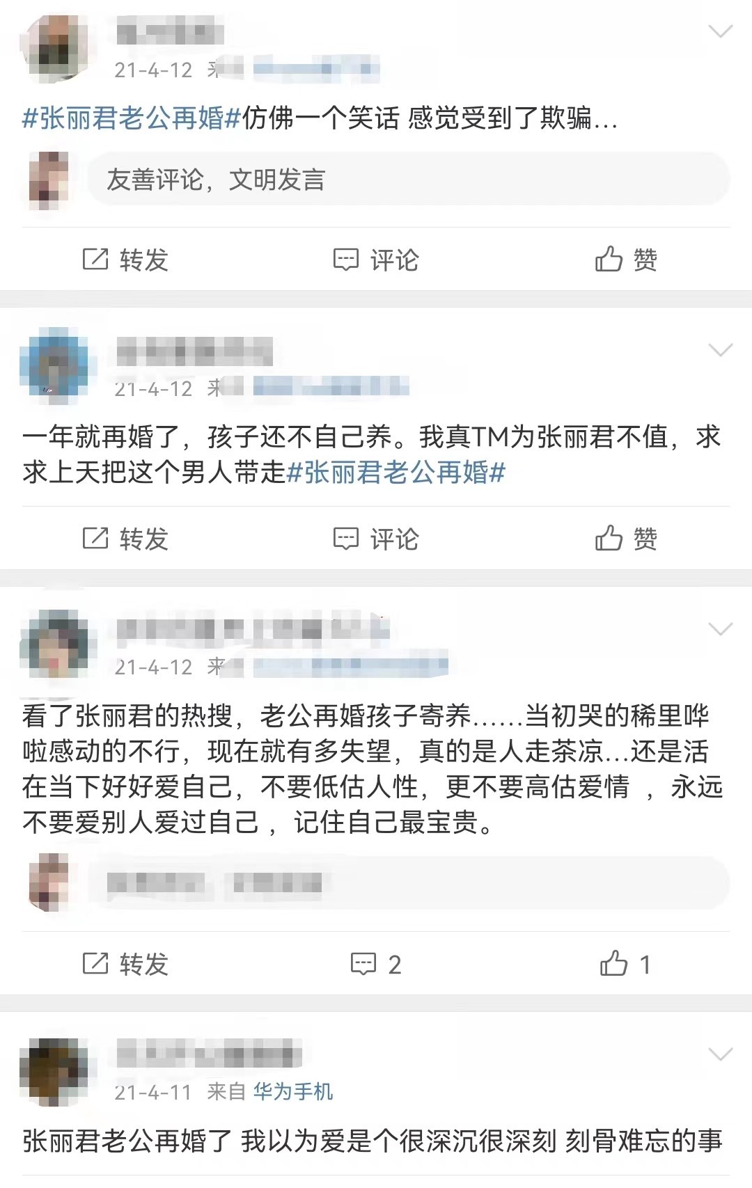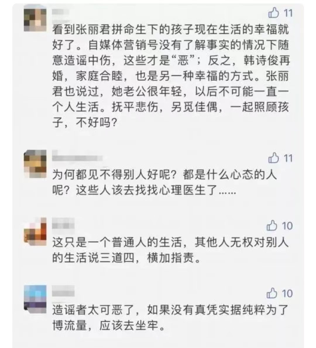 数不清的网友替张丽君不值,可怜她舍命生子却成为丈夫的累赘,并大肆责问韩诗俊“凭什么再婚”,咒骂他薄情寡义。