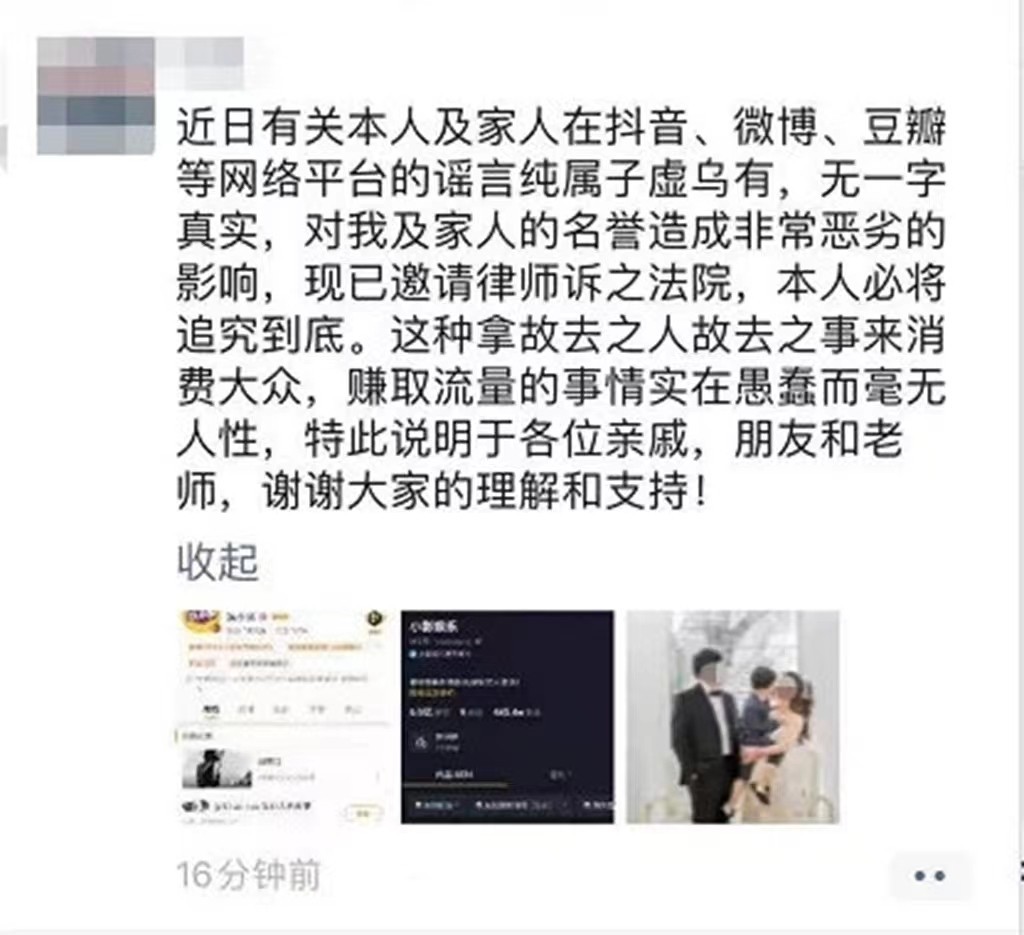 韩诗俊在配文中控诉谣言子虚乌有,说已请律师诉至法院。