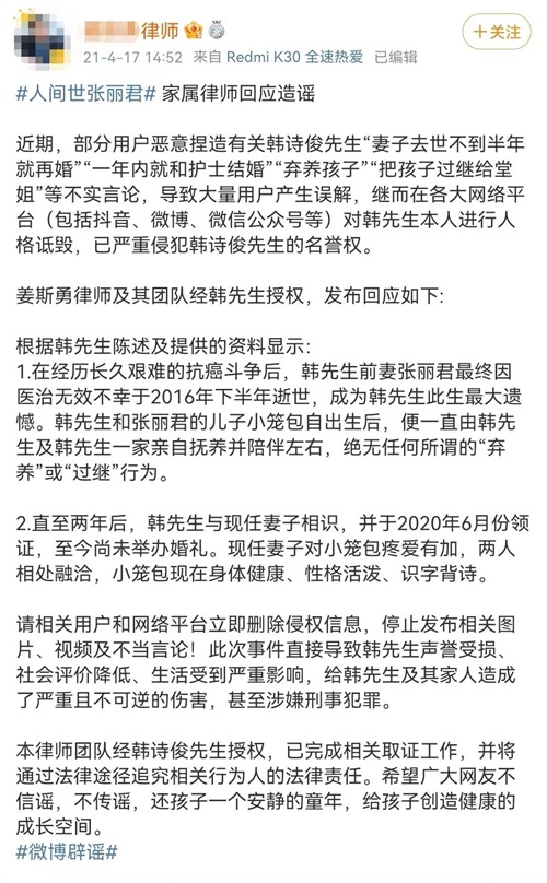 声明中,韩诗俊说张丽君早逝是自己一生最大的遗憾,他和父母一直抚养和陪伴小笼包。