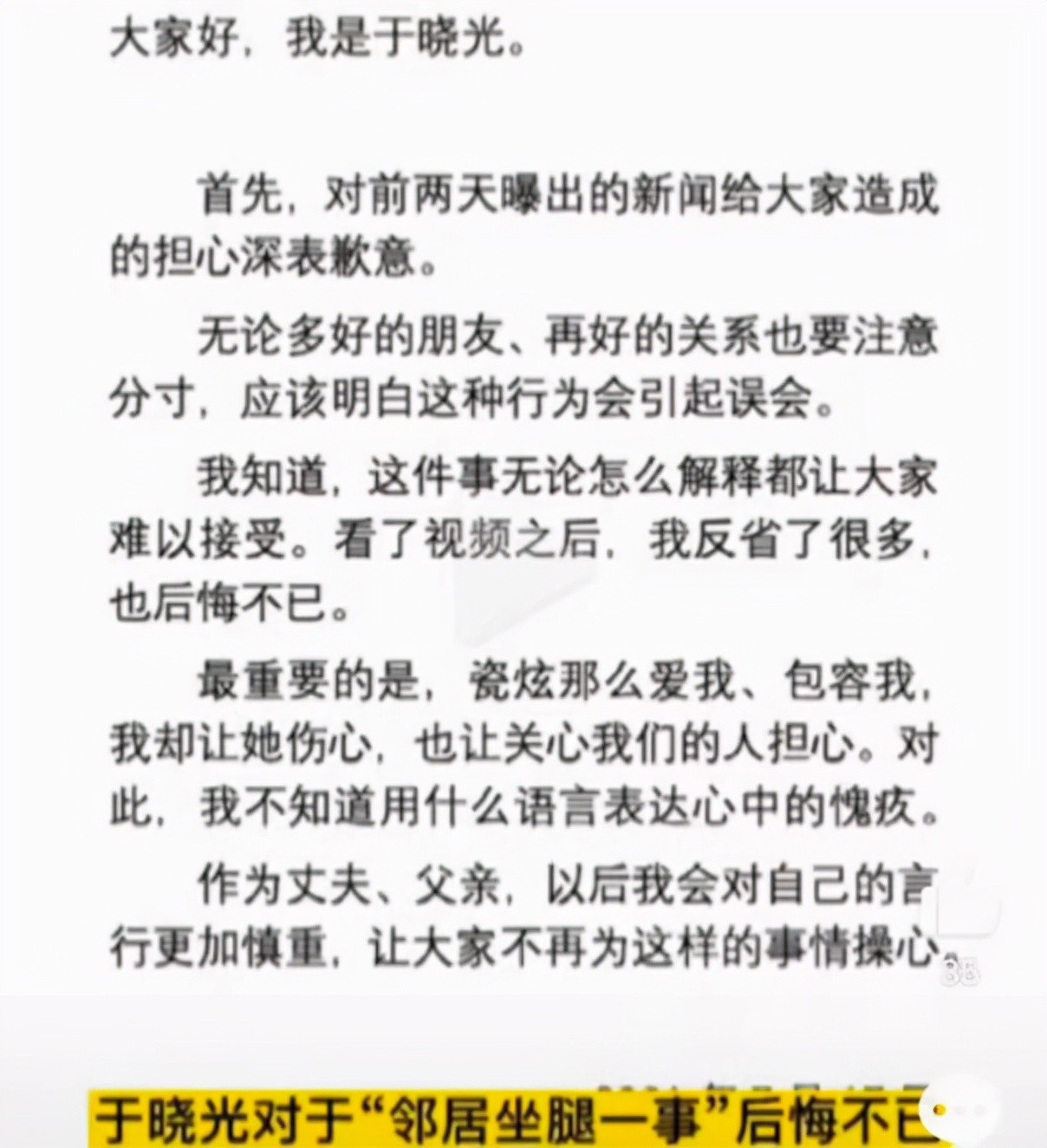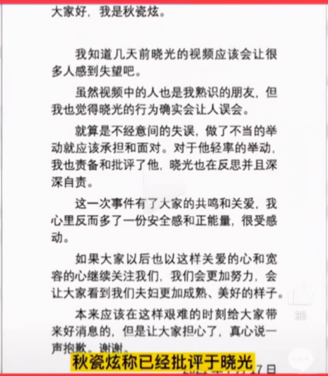 随后秋瓷炫也发文替老公道歉,并且表示已经批评过于晓光了。