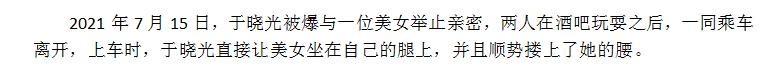 2021年7月15日,于晓光被曝和一位美女举止亲密,酒吧玩到深夜后乘车离开。