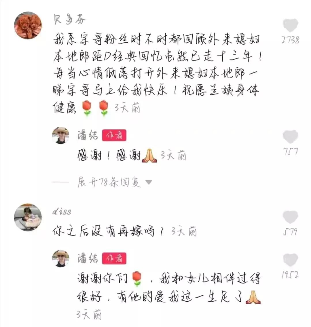 曾经有一位康祈宗的忠实粉丝留言问她会再嫁吗?潘洁留言回复道:我和女儿相伴过得很好,有他的爱我这一生足矣!
