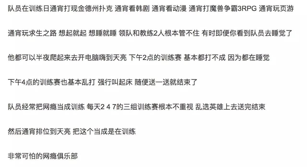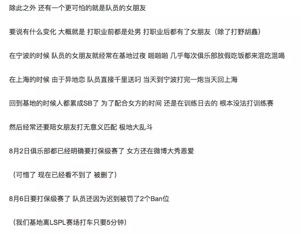 文中更提到“更可怕的就是队员的女朋友”,吐槽队员因为谈恋爱不重视训练和比赛。比如指责队员女友经常来基地过夜!还有什么保级赛前和女友秀恩爱!