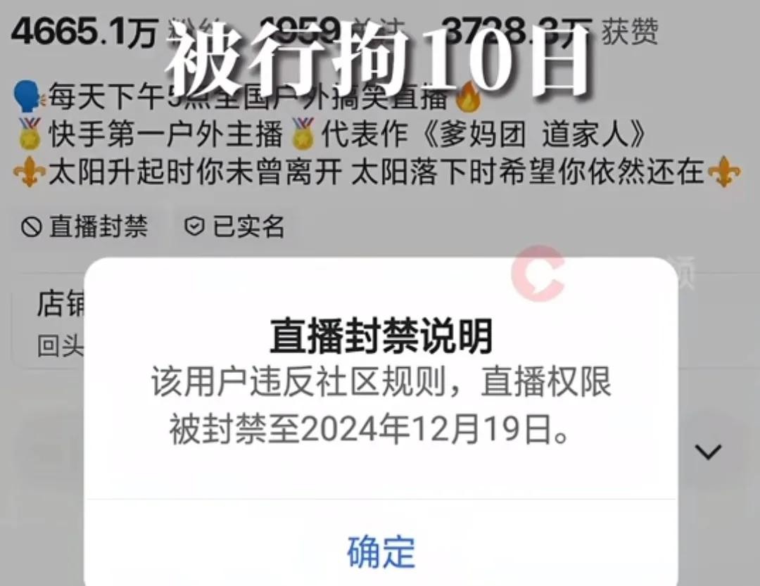 除了拘留10日之外,该网红还被平台暂时封禁半个月。