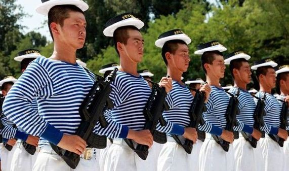 小编一直认为,海魂衫原本是专用于海军体系内,作为类似于内衣的一种服饰,普遍为白蓝相间的条纹衫,穿在兵哥哥的身上可能是下面这样慷慨激昂,群情激奋。