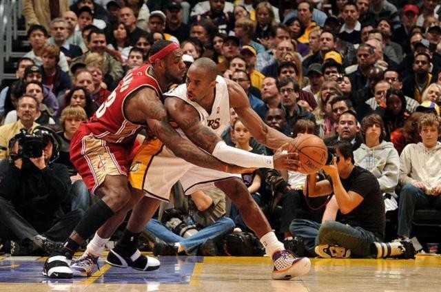 比赛开局,科比就用标志性的后仰跳投为湖人先拔头筹,詹姆斯则多次反击上篮得手,还顶着夸梅·布朗和拉马尔·奥多姆的严防打成2+1。科比也毫不示弱,连续两次单挑詹姆斯强势回应,第一节战罢,双方平分秋色。