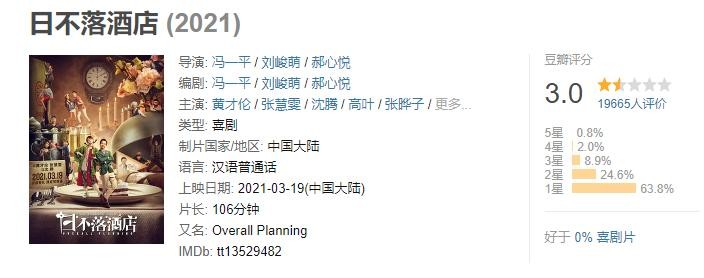 当初买了特价票观看,最后觉得还是好亏!感觉可以和毕志飞的《逐梦演艺圈》一较高下,《日不落酒店》由开心麻花成员黄德伦主演,一举获得3.0的豆瓣评分,口碑砸的稀巴烂!