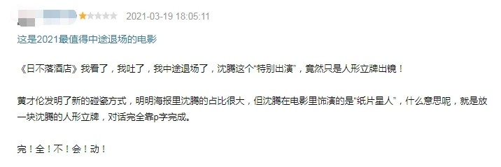 多少人冲着海报上的沈腾去的,结果片中只是一个纸片人!人形立牌的出场加起来勉强凑够十分钟,见过蹭的,没见过这么脸皮厚的。