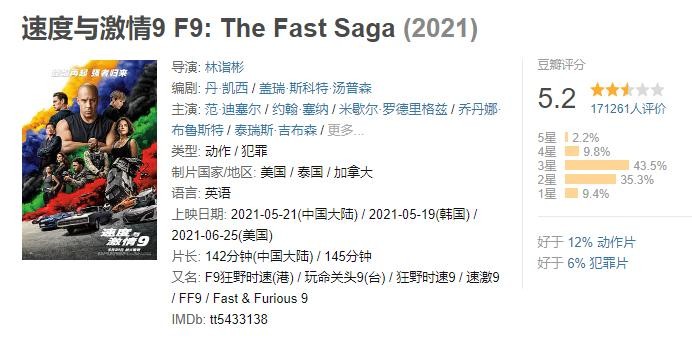 《速度与激情9》一定是今年最受期待的好莱坞大片之一,上映前猫眼想看人数曾飙到128万,然后没有想到的是,与票房成反比的是口碑,国外烂番茄好评率只有区区33%,国内的豆瓣评分也低至5.2分,远低于业内预期。
