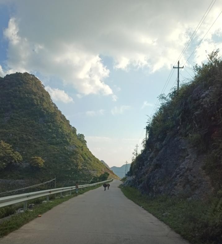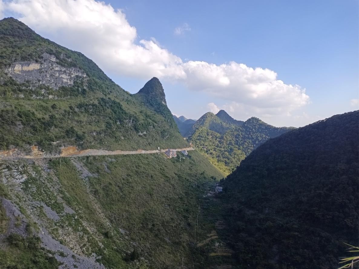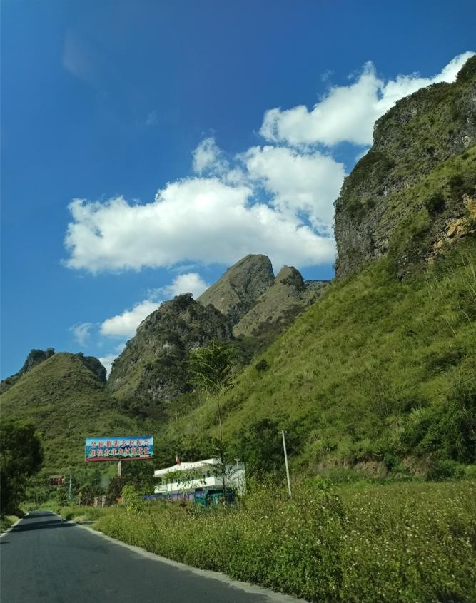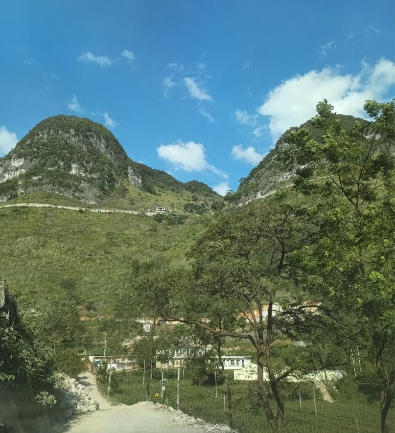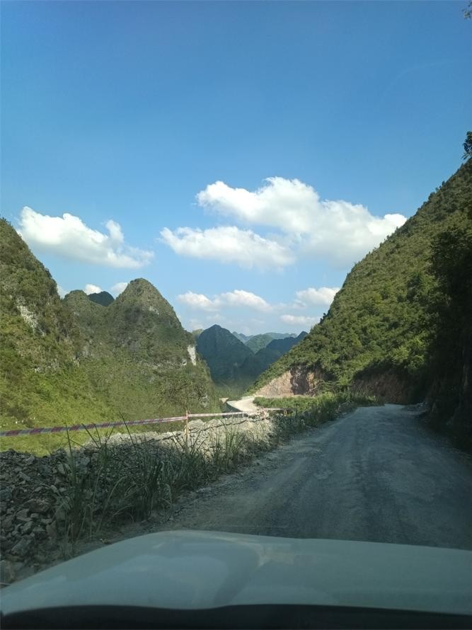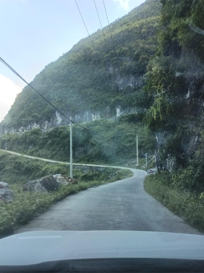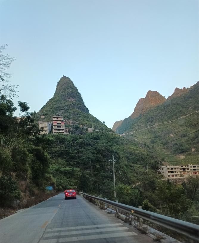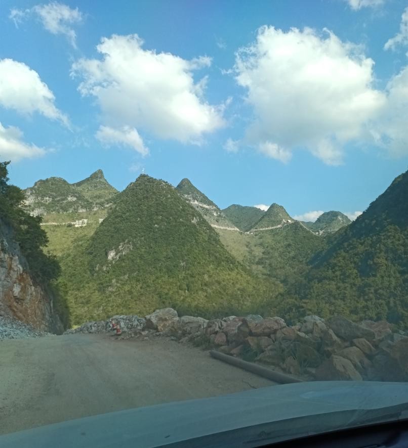 由于道路狭窄,较少能找得到适合停车的地方,所以很多照片都是直接坐在车里拍的,质量不是很好。沿途路边偶尔出现几户稀稀落落的房屋,家门口两三米远的地方就是公路,可以说出门就到了公路。这些人家的孩童们三三两两地聚到一处,在家门口的路旁玩起了“过家家”。在这大石山中,确实空间与资源都十分有限,要么上山要么下山,不容易找得到一块像操场一般的活动场地,稍微平坦些的地方,早已建起了不甚宽敞的房屋。看着那些小朋友们,最小的可能仅有一岁多两岁,开车路过须得十分小心谨慎。我想,他们每天听到最多的一句话,大概是大人们嘱咐他们要注意来往的车辆,这毕竟是个极大的安全隐患。