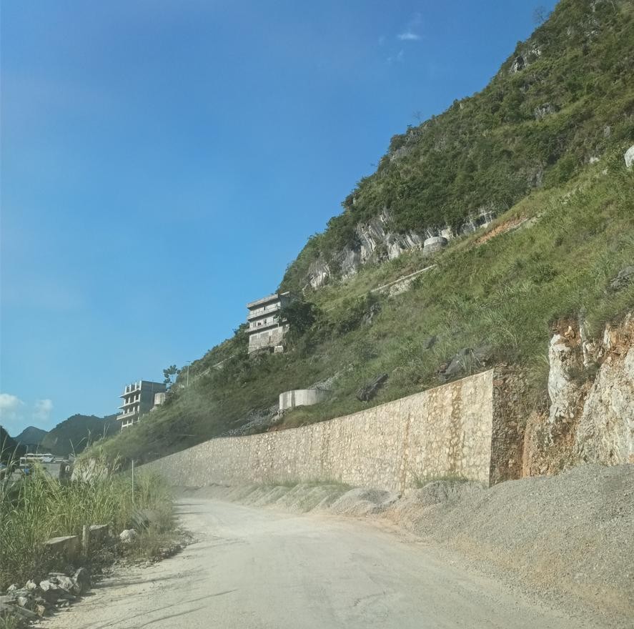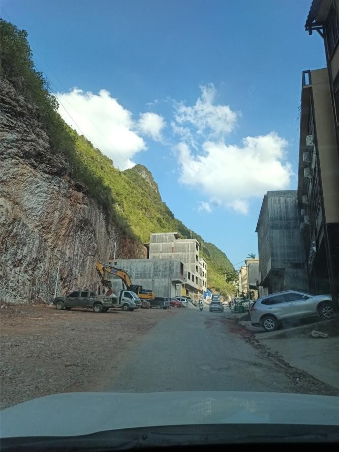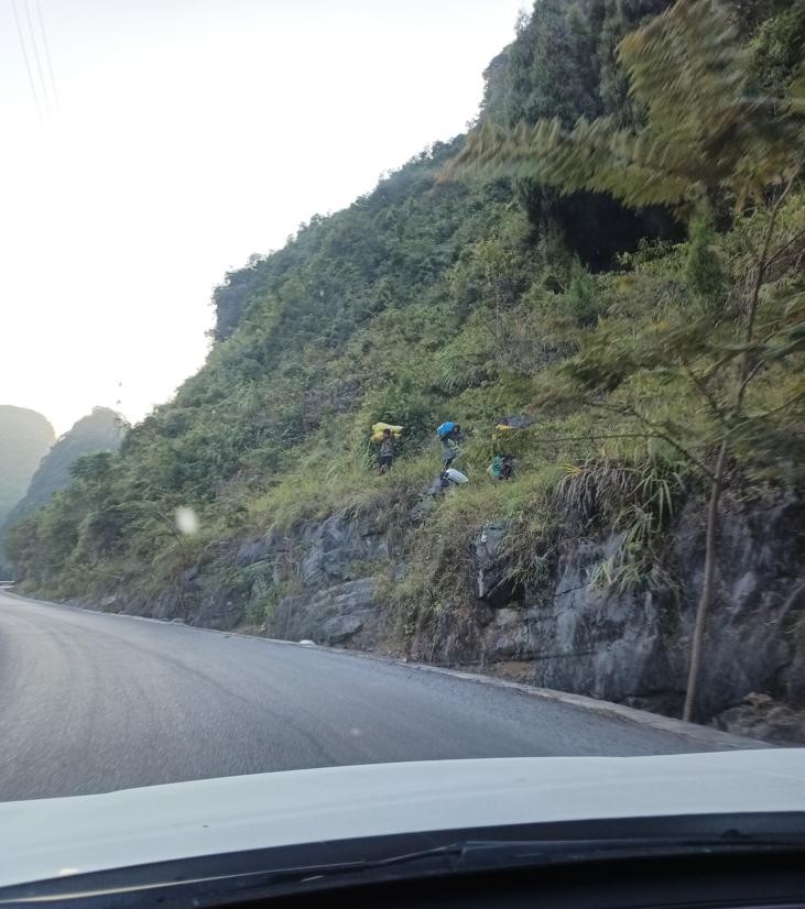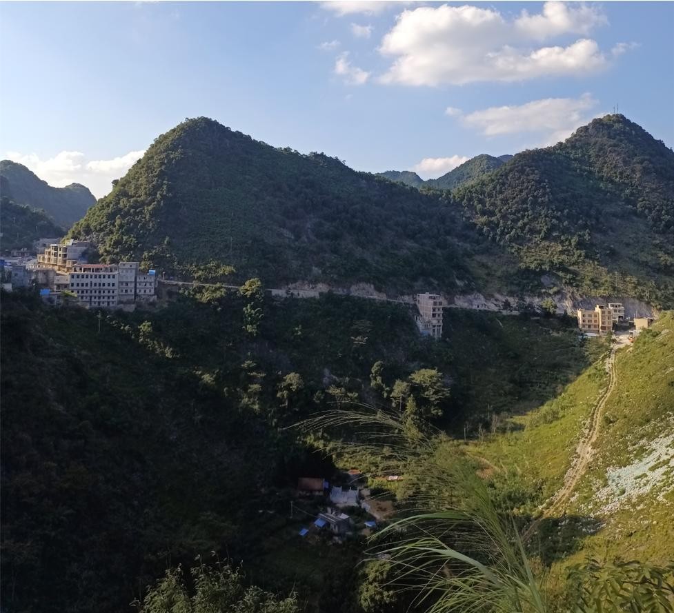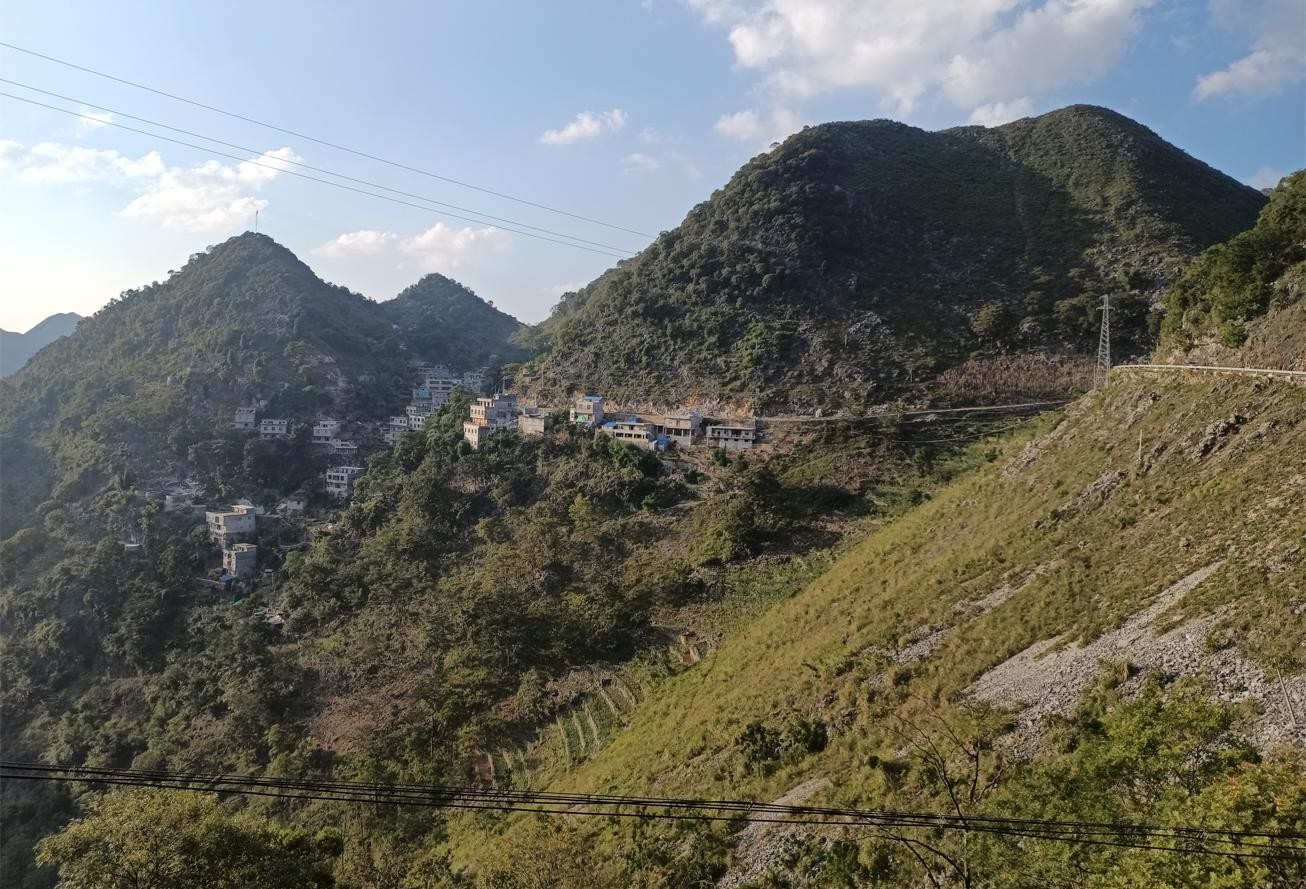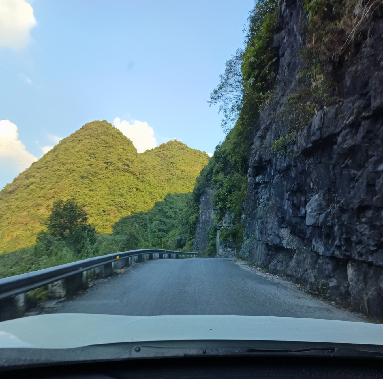 由于道路狭窄,较少能找得到适合停车的地方,所以很多照片都是直接坐在车里拍的,质量不是很好。沿途路边偶尔出现几户稀稀落落的房屋,家门口两三米远的地方就是公路,可以说出门就到了公路。这些人家的孩童们三三两两地聚到一处,在家门口的路旁玩起了“过家家”。在这大石山中,确实空间与资源都十分有限,要么上山要么下山,不容易找得到一块像操场一般的活动场地,稍微平坦些的地方,早已建起了不甚宽敞的房屋。看着那些小朋友们,最小的可能仅有一岁多两岁,开车路过须得十分小心谨慎。我想,他们每天听到最多的一句话,大概是大人们嘱咐他们要注意来往的车辆,这毕竟是个极大的安全隐患。