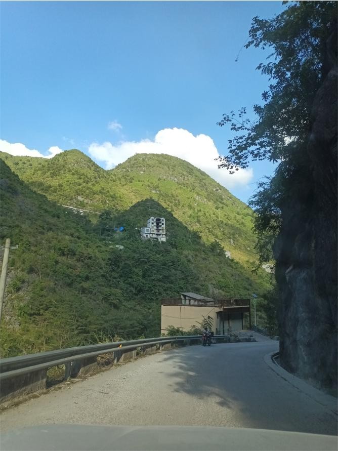 这里的房子建造实属不易,尤其是那些低于道路海拔的房子,他们首先要在靠近山谷的一侧撑起钢筋水泥大柱子,再在架起的平面上开始建造一层、二层、三层,不甚平整的最底一层可以用来做牛栏之所。好在这里的山都是石头山,山体十分牢固,不会出现山体滑坡等地质灾害,所以安全性还是有很大的保障。因为路面比较窄,路两旁几乎没有多余的空地用来停泊小车,所以很多顶层与路面几近持平的房子,屋顶便是用来做自家的停车场了。这里的房子都是用水泥砖建造,据说偏远山弄里的居民,因为交通不便,他们建房子用的水泥砖,是用马匹一趟一趟地运送过去的,一般一趟只能驼4块水泥砖。