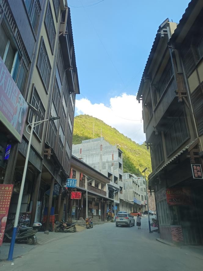 906乡道从中间穿过七百弄乡的集市,路面依然很窄,并没有因为是集市而显得稍微宽大一些,而究其原因,自然是因为集市处在一条狭长的山沟之间,除了路面,左右两边仅能各建起一栋房子,而房子的背面则紧挨着山体。