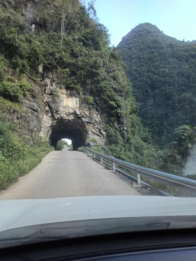 道路不但窄,而且还时不时地出现一个急弯,有些地方不得不凿穿了山体从中穿过。