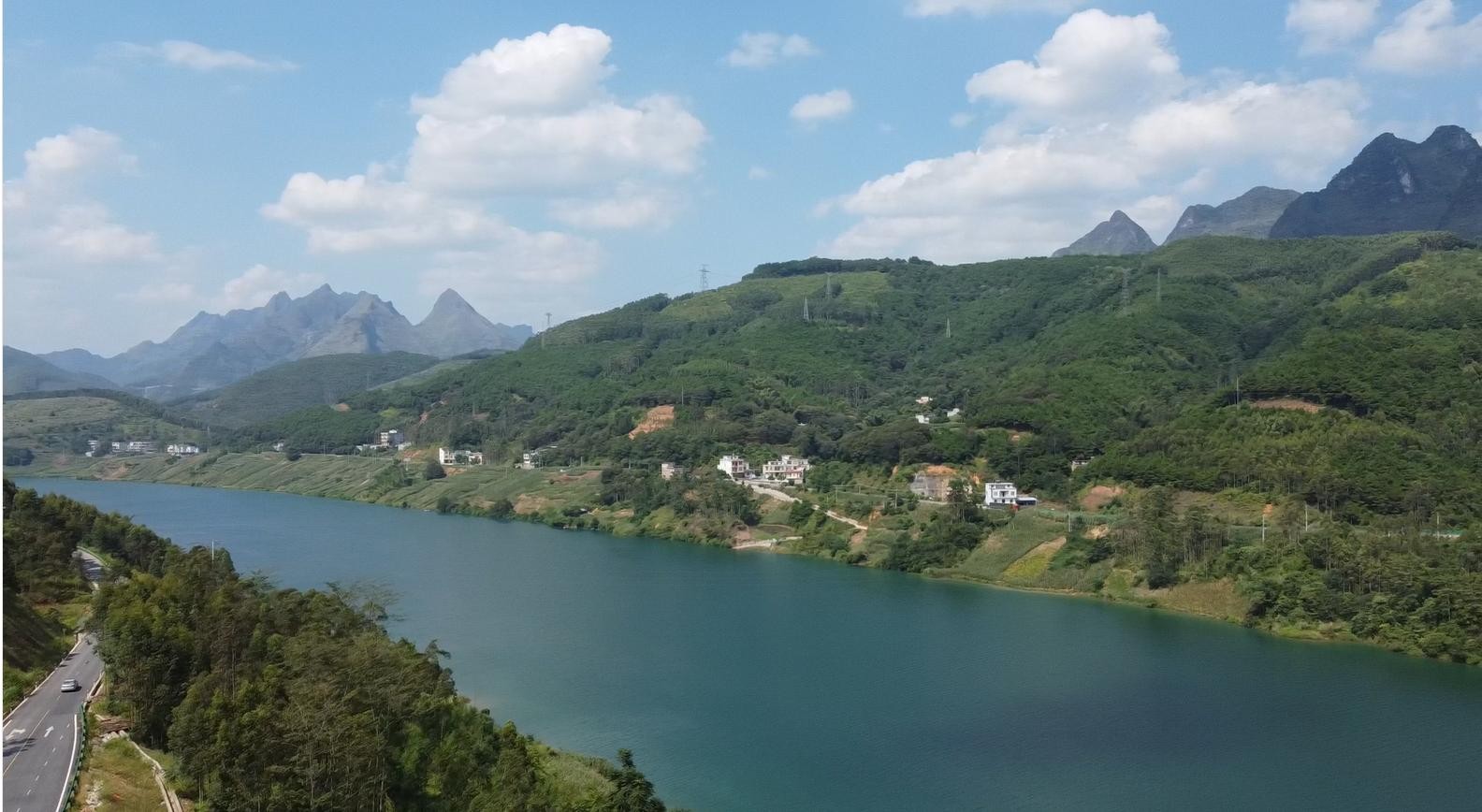 红水河因流经红色砂贝岩层,水色红褐而得名,她在这片喀斯特地貌土地上弯弯曲曲地延绵数百公里,平均宽度100多米,平均水深23米,落差达254米。沿岸的风景极其秀美,倒映着绿水青山,河水也呈现出一种难得的清绿,与其名不甚相符,倒是应该叫“绿水河”才是。