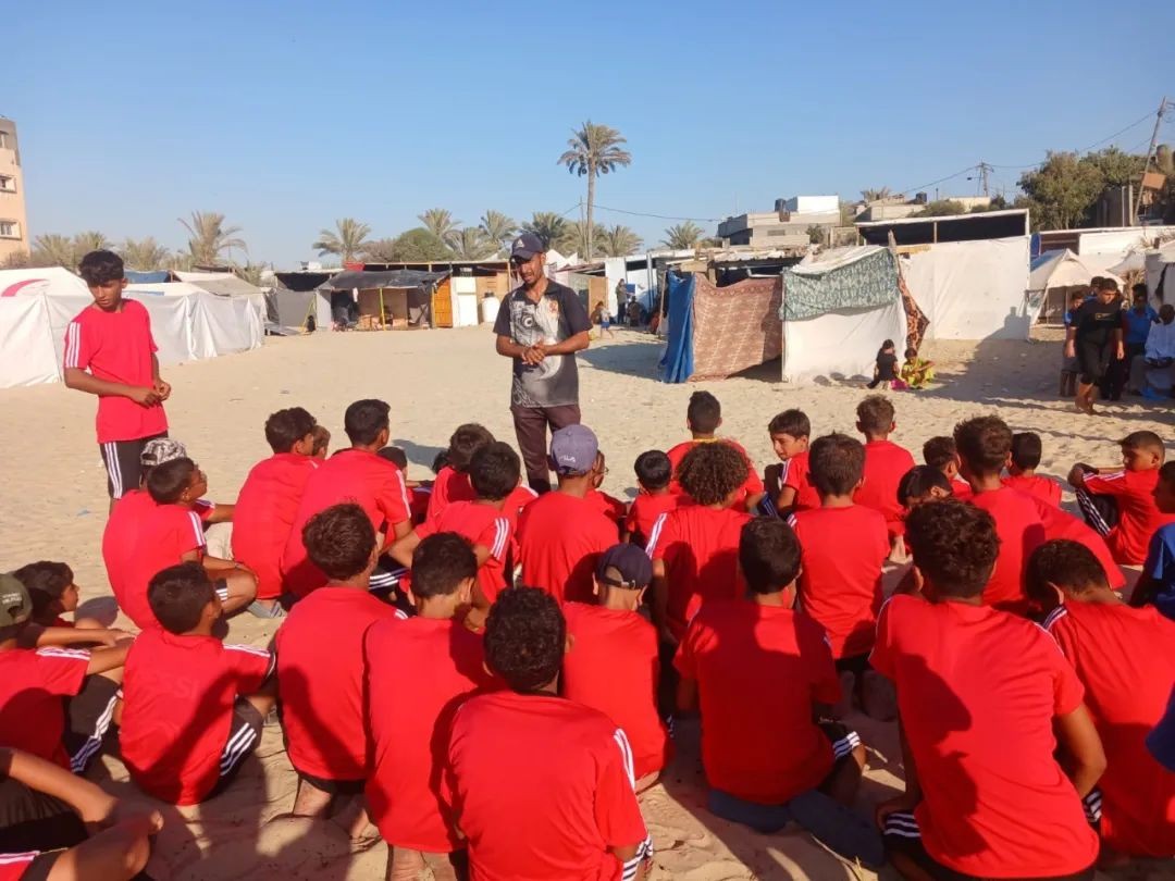 在加沙地带南部海边的汗尤尼斯城区(Khan Yunis),几十个孩子围坐在一块空闲的沙滩上,一位教练正在这片「临时足球场」给他们传授足球理论。