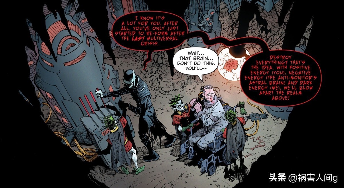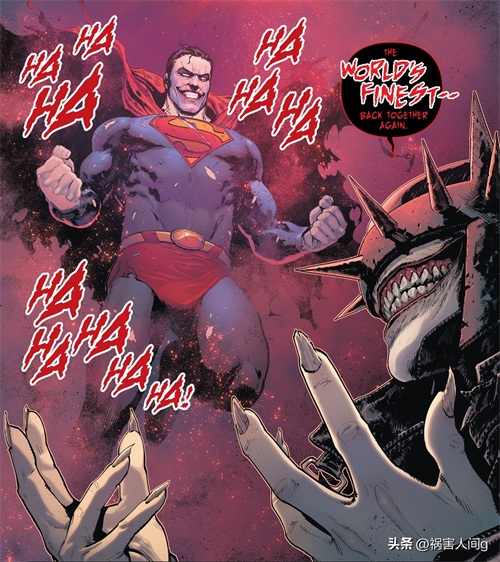小丑化的超人解救了狂笑之蝠,他问狂笑之蝠,这么做的目的是什么,狂笑之蝠回答是为了摧毁多元宇宙中所有的生命。