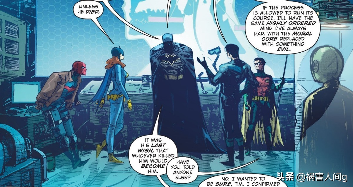 三天之后,蝙蝠女孩、夜翼、红头罩和红罗宾在蝙蝠洞训练,与蝙蝠侠讨论了感染毒素的情况,结果蝙蝠侠体内的毒素爆发,趁几位少年英雄不备的情况下,他突然拔出了枪,射杀了几位少年英雄。